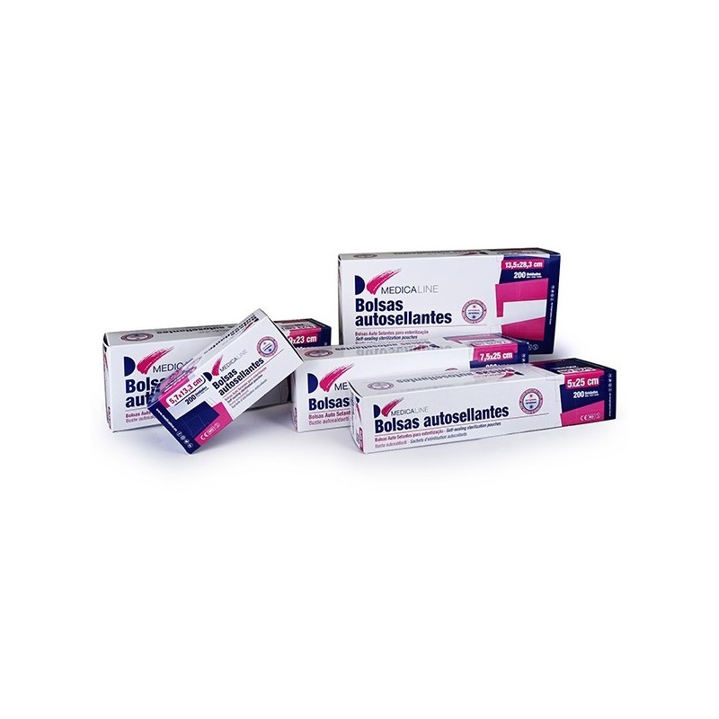 Bolsas para esterilización.Bolsas autosellantes, resistentes y de alta calidad. Doble testigo de esterilización. Caja de 200 unidades.