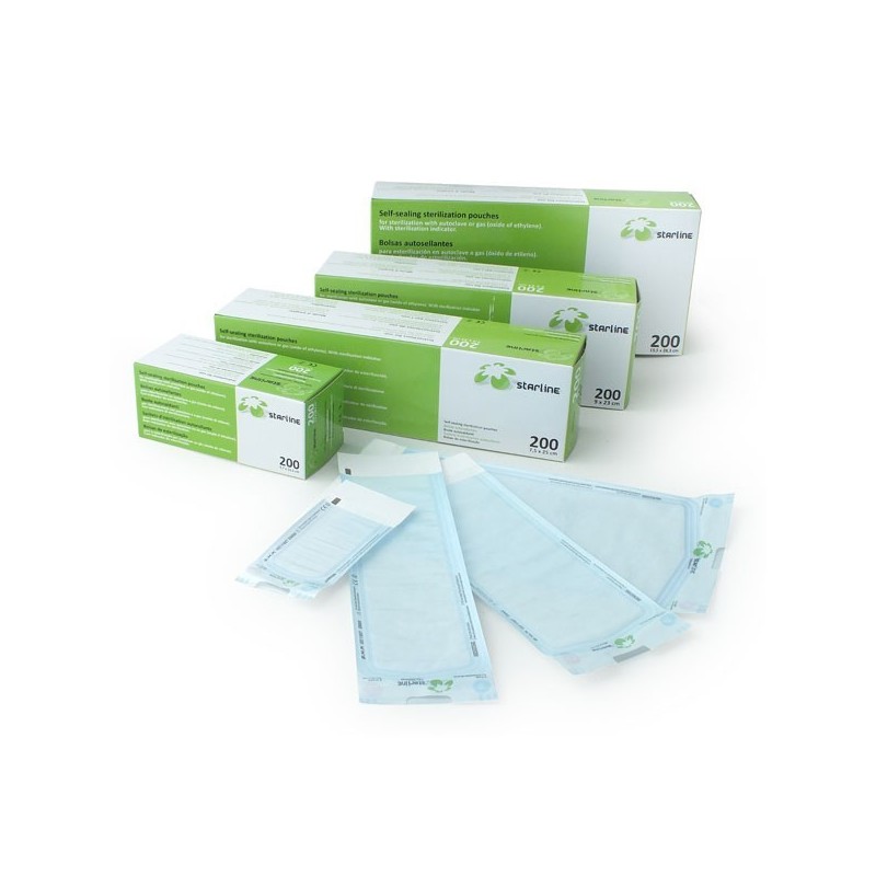 Bolsas autosellantes para esterilización, de gran resistencia y calidad. Fabricadas con una capa de papel y otra de plástico para la visualización del contenido. Incorpora un testigo de esterilización para la verificación del proceso.Caja de 200 unidades. Tamaño 7,5x25 cm.