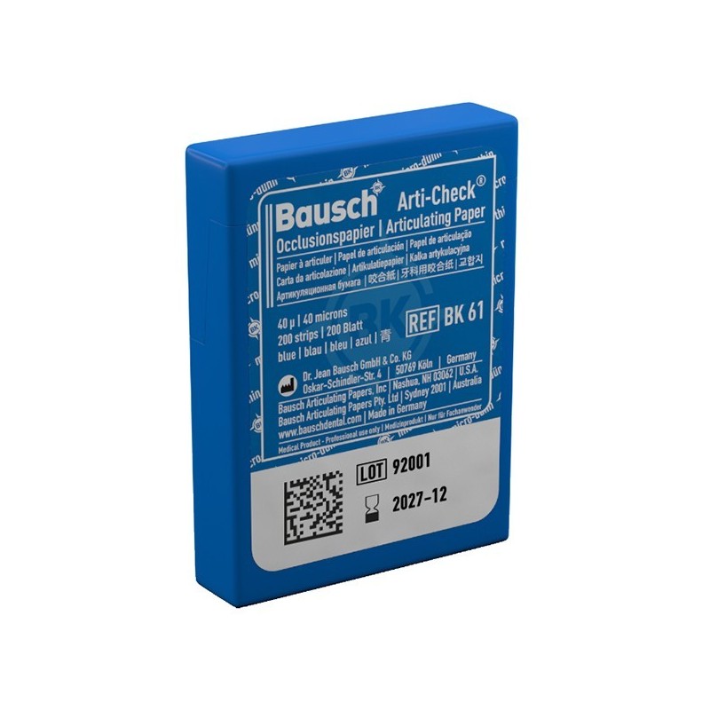Papeles de oclusión microfinos de 40 um. son papeles muy finos recubiertos por ambas caras con tintas lÌquidas. Debido a su pequeño grosor, estos papeles muestran un comportamiento de marcado extremadamente preciso. De este modo, se reducen significativamente los contactos defectuosos o borrosos.Su recubrimiento especial con tintas lÌquidas permite marcar claramente todos los contactos oclusales, incluso sobre materiales difÌciles de comprobar, como las cerámicas, las aleaciones metálicas, las resinas y las superficies oclusales humedecidas con saliva.Su recubrimiento cromático especial consiste en una infinidad de pequeñas microcápsulas rellenas de pigmentos.Incluso con una ligera presión de masticación, las cápsulas se abren y liberan el color de forma claramente visible. También permiten marcar de forma repetida, ya que el recubrimiento de color posee un volumen de tinta elevado.Envase de tiras, color azul. Tamaño 52x20 mm. 200 unidades.