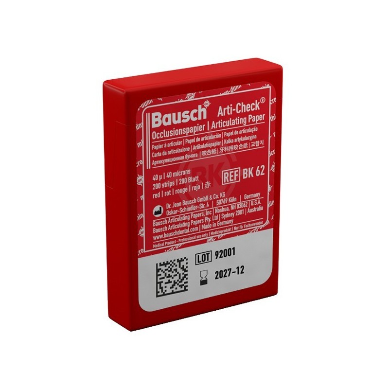 Papeles de oclusión microfinos de 40 um. son papeles muy finos recubiertos por ambas caras con tintas lÌquidas. Debido a su pequeño grosor, estos papeles muestran un comportamiento de marcado extremadamente preciso. De este modo, se reducen significativamente los contactos defectuosos o borrosos.Su recubrimiento especial con tintas lÌquidas permite marcar claramente todos los contactos oclusales, incluso sobre materiales difÌciles de comprobar, como las cerámicas, las aleaciones metálicas, las resinas y las superficies oclusales humedecidas con saliva.Su recubrimiento cromático especial consiste en una infinidad de pequeñas microcápsulas rellenas de pigmentos.Incluso con una ligera presión de masticación, las cápsulas se abren y liberan el color de forma claramente visible. También permiten marcar de forma repetida, ya que el recubrimiento de color posee un volumen de tinta elevado.Envase de tiras, color rojo. Tamaño 52x20 mm. 200 unidades.