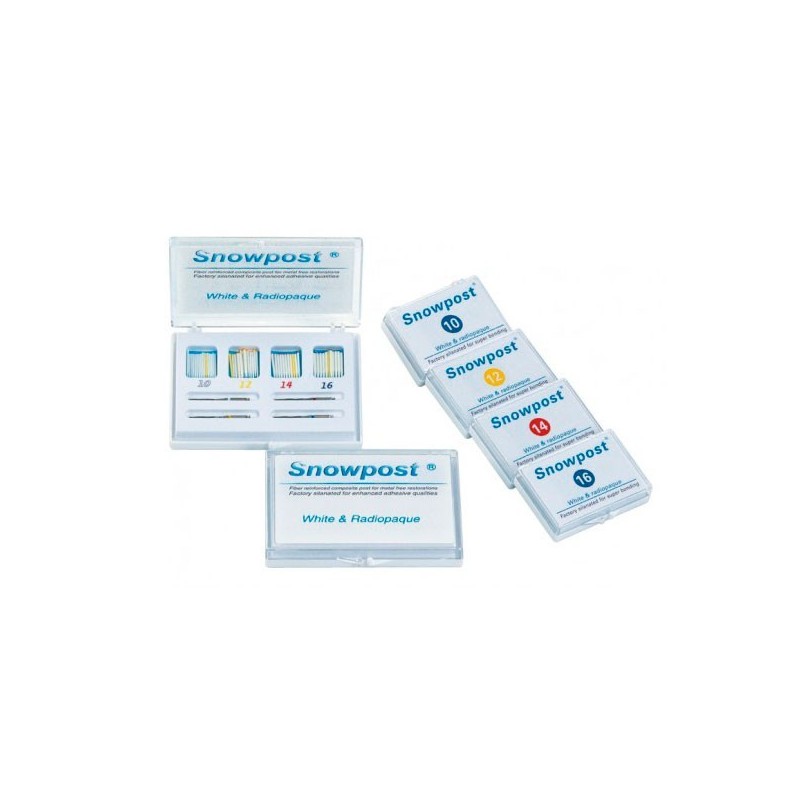 Postes Blancos de FibraPresentación: CajaContenido: 10 unidades.CaracterÌsticas: ÿ 1 mm. Blanco. Radiopacos, de fibra de sÌlice. Biocompatibles. Snowpost es el primer poste radiopaco y blanco de fibra de sÌlice para reconstrucciones estéticas.