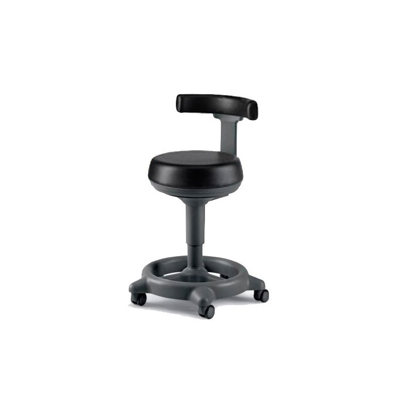 Taburete para profesional con estructura de poliamida extruida reciclable, ignifuga, antirrayas y antichoques, equipada con cinco ruedas autobloqueantes. Asiento de poliuretano indeformable que reduce la carga en la espalda y en la pelvis. Respaldo envolvente y anatómico, ajustable.