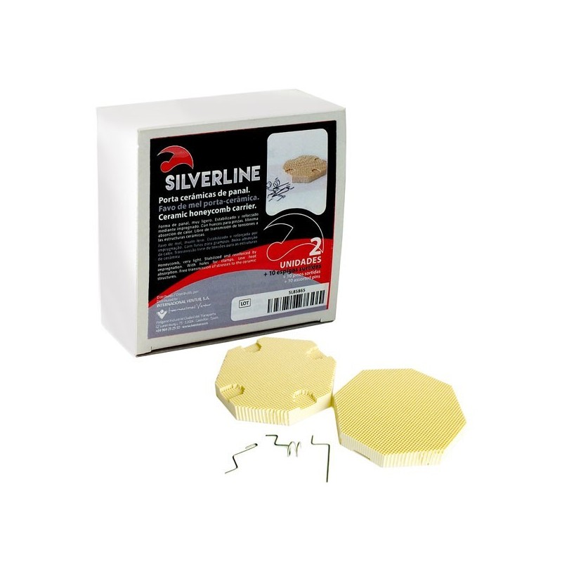 Porta cerámica de panal. Muy ligero. Estabilizado y reforzado mediante impregnado. Con huecos para pinzas. MÌnima absorción de calor. No transmite tensiones a las estructuras cerámicas.2 unidades.10 espigas surtidas.